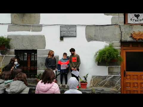 Bertan, lehenik Anaia, Eñaut eta Markelek Lehen Hezkuntzako ikasle guztiei Mª Doloresen inguruko kontuak azaldu dituzte. Ondoren, gelan prestatu duten bideoa ikusteko aukera ematen duen QR-a itsatsi dugu Etxeberrin, Mª Doloresen plakaren azpian.