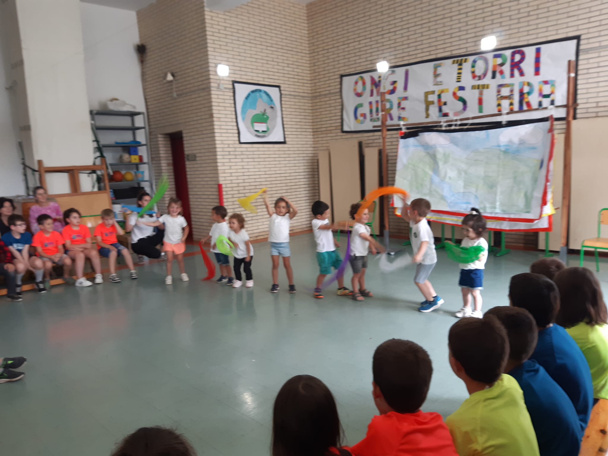 Amaitzeko guraso, ikasle eta irakasleek eskolari eskainitako bertsoa abestu eta Eskola Txikitako Festako dantza egin zuten.